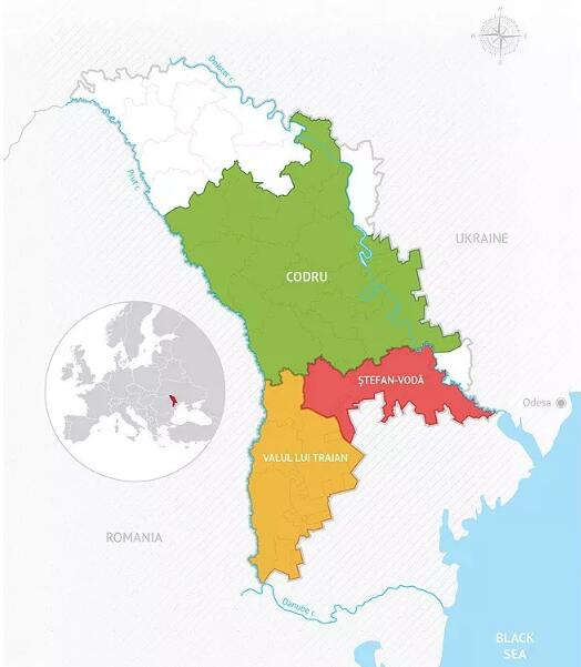摩爾多瓦的國土面積跟我國的海南省(35400平方公里)差不多大,但是有著超過五千年的釀酒歷史。對于葡萄種植,擁有著得天獨厚的地理和氣候條件。摩爾多瓦絕大部分葡萄園位于北緯46°和47°之間,肥沃的黑鈣土地,遍布全國的丘陵、谷地提供了優質的斜坡,同時還有南部的黑海調節氣候。摩爾多瓦的大部分國土都適宜種植葡萄,一共被分成4個產區:Valul lui Traian產區(西南部)、Stenfan Voda產區(東南部)、Codru產區(中部)和Divin迪文(全國)。