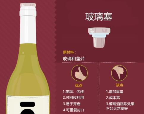 盡管玻璃塞在美國沒有被廣泛采用,但這種瓶塞在歐洲部分地區(qū)很受歡迎,如德國和奧地利。這種玻璃塞十分美觀,可回收利用,而且能有效防止葡萄酒氧化。另外,如果一瓶葡萄酒開瓶后還沒飲用完,只需把玻璃塞重新蓋上即可,十分方便。這種瓶塞的缺點是,給葡萄酒增添一定的重量,且成本較高。