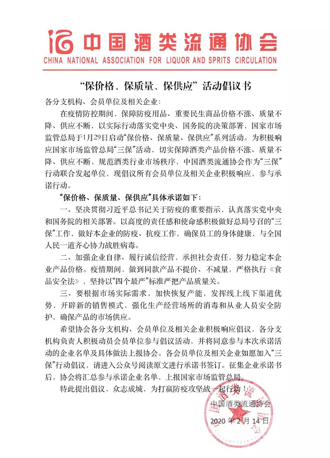報(bào)名參加“三保”酒類企業(yè)承諾,將以高度的責(zé)任感和使命感積極做好總局號召的“三保”工作,做好本企業(yè)的防疫、抗疫工作,確保員工的身體健康,承諾切實(shí)保障酒類產(chǎn)品價(jià)格不漲、質(zhì)量不降、供應(yīng)不斷,規(guī)范酒類行業(yè)市場秩序。