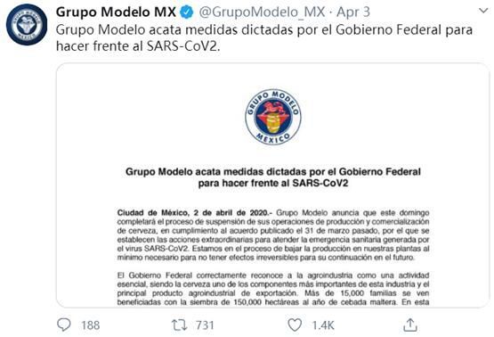 莫德洛集團在推特上發表的一份聲明中表示,由于墨西哥政府已經關閉了非必要的商業活動,所以該公司正在停止其啤酒生產和銷售。