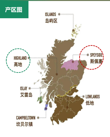 是蘇格蘭地理面積很大的產區,威士忌風格多樣。一般來說高地威士忌較為粗獷,帶有辛辣和煙熏的味道,口感豐富。
